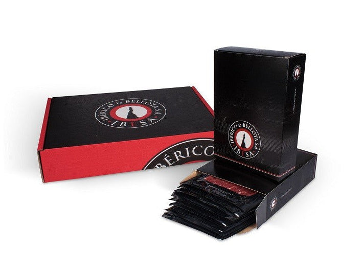 10 sobres de 100 gramos de Paleta de Bellota 100% Ibérica certificada por la denominación de origen Los Pedroches loncheada a máquina o a cuchillo a elegir.